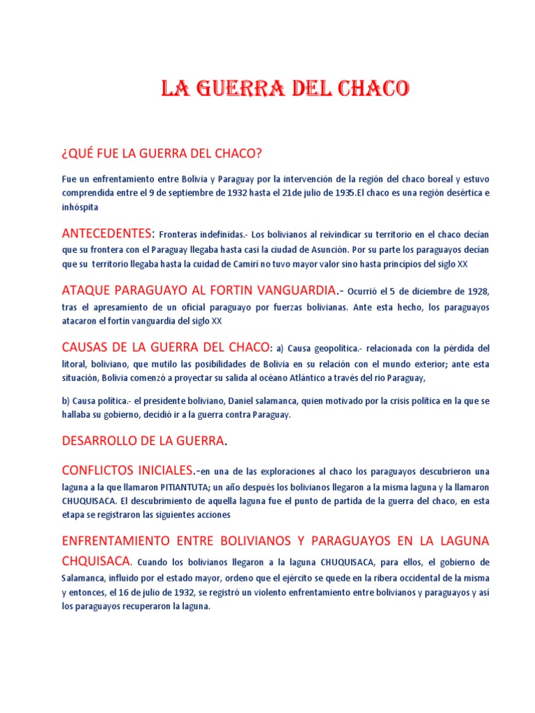 La guerra del chaco fue opacada por las dos guerras mundiales, pero fue un conflicto de proporciones lamentables. Bolivia funda fortines en el chaco. La misma se desarrolló desde el día 9 de septiembre del año 1932 hasta el día 12 de junio. La guerra entre bolivia y paraguay: La guerra entre bolivia y paraguay